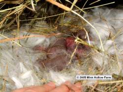 When a doe makes a nest she will collect grass or straw (or whatever is available) and make a soft place for her babies. She will also pull fur out from her own body to line the nest. This keeps the babies warm as they will be born completely hairless as well as blind and deaf. Once labour begins, it is often all over with in one or two hours. By then she will have had all her babies (we've had does successfully raise litters of 12), and she will have cleaned them and herself and given them their first feeding. Rabbits must be left COMPLETELY alone when having their babies as any added stress can cause her to scatter them outside the nest or sometimes even cause her to cannibalize her newborns. After this she may refuse to care for them. Hand raising baby rabbits is almost impossible and even experts have very limited success.