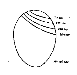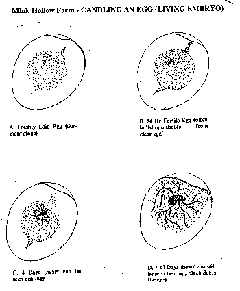 The eggs should be candled at 7 days' incubation, then again at 14 and 21 days. By four days, the heart will be partially formed and if you are patient you will be able to see it beating. At seven days, the eyes are visible as relatively large black dots, and the embryo will be in almost constant movement. At 14 days you should be able to make out a rough outline of the embryo and by 21 days the entire egg will be nearly blacked out. After this time you will gain more information by looking at the two ends of the egg, where you should be able to see occasional movement. Any eggs found to be dead or infertile should be removed from the incubator. Clear (infertile) eggs are fairly easy to spot at 7 days and should be discarded at that time.