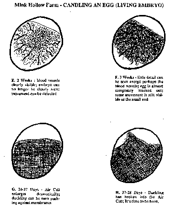 If you decide to start with freshly laid eggs, the process will be slightly more involved. The eggs are candled before you get them and you will be given only well-shaped, strong shelled eggs with no cracks or other visible internal abnormalities. Our fertility rate is high (approx. 95%), but we cannot guarantee that the eggs are fertile as there is no way to tell without looking at the germinal disk attached to the yolk under a microscope. Under OPTIMUM conditions, one can expect to hatch approximately 65 to 75 percent of all eggs set. However, it is possible for a hatch to fail entirely especially if only a few eggs are set. If this should happen, we will do our best to provide you with ready-to-hatch replacements, or just hatched ducklings so the students won't be too disappointed. Having a hatch fail can be discouraging, but it is in itself a valuable lesson too.
