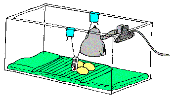 If you do not have access to an incubator, it is possible to 'build' one using an aquarium and a desk lamp. The aquarium must be box-shaped (no fish-bowls), and not too large - the 5gallon kind are great. In order for this to work, you must have an accurate thermometer (we sometimes have incubator thermometers available). Note: “fever” thermometers will not work. Household thermometers will work in a pinch. Our advice is to buy 3 - the two that agree are likely to be right. You must also be prepared to spend extra time experimenting with the placement of the heat source (the desk lamp) in order to get the correct temperature.