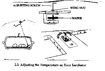 Most manufactured incubators have a thermostat and a heating element, often mounted inside the lid. The thermostat is set using the small up-side down 'L' shaped adjusting screw which is often secured with a wing nut of some sort. To set the temperature, fill the water receptacles with warm water, put the lid on the incubator and plug it in. There should be a small (red) light that comes on whenever the heater is on (like the oven light on your stove). Loosen the wing nut part way and turn the adjusting screw counter-clockwise several turns. The indicator light should now be on. As the incubator heats up, check the thermometer every 5-10 minutes until it reaches about 98 degrees (F). Then check it more often as the temperature continues to rise and once it gets to 99 degrees (F), stay with it. Watch the thermometer (WHICH HAS BEEN PLACED WHERE THE EGGS ARE GOING TO BE) and once it reads 99.5 (F), turn the adjusting screw clockwise (lower) just until the indicator light clicks off. Stop turning when the light clicks off and leave the incubator sit for about 30 minutes, then check the temperature again. If it's still correct (99.5 F), you're done. Tighten the wing nut until just snug and you're ready for your eggs. If the temperature is wrong, adjust the screw higher or lower as appropriate by no more than 1/4 turn each time, leaving 15-20 minutes between each adjustment to allow the incubator to stabilize.