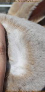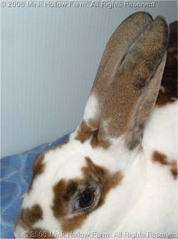 This gene is not completely recessive to E which means that a rabbit that is Eej will show some brindling. This can almost always be seen on an agouti (A-) or tan (At-) but may be hidden in a self (aa). It is easiest to see inside the ears. Notice how the brindle seems to be trying to come through as spots on the broken castor below.
